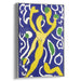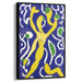 The luminous yellow figure, with its elongated limbs and fluid motions, exudes a sense of freedom and uninhibited expression, set amidst abstract shapes and splashes of green and white that add depth and mystery to the composition. The rich royal blue dominating the piece creates a powerful contrast with the bright yellow, evoking a blend of joy and serenity, a visual symphony of emotions.