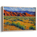 The painting's foreground bursts with a rich tapestry of colors, leading the eye through sandy paths to the focal point - the bold red and orange mountains that command attention. These striking hues play against the cool blues of the distant mountains, creating a dynamic and layered composition that infuses depth and drama into the scene. The serene blue sky above acts as a tranquil backdrop, accentuating the grandeur of the mountains below.