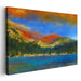 Immerse yourself in the awe-inspiring beauty of 'Ethereal Horizon,' a captivating canvas art print that transports you to a vibrant mountain landscape. This artwork beautifully captures a tranquil mountain scene, where majestic peaks are bathed in a warm, golden light, contrasting beautifully with the cool, serene blue of the lake in the foreground. The sky, painted in fiery oranges and deep reds, hints at the peaceful time of either dawn or dusk, infusing the scene with emotional depth and contemplation.