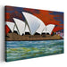 The focal point of this piece is the Sydney Opera House, depicted with its distinctive white sails standing out boldly against the intense red and orange hues of the sky. The contrast between the architectural purity of the Opera House and the fiery sky creates a sense of grandeur and magnificence, drawing the viewer into a scene of architectural beauty and artistic mastery.