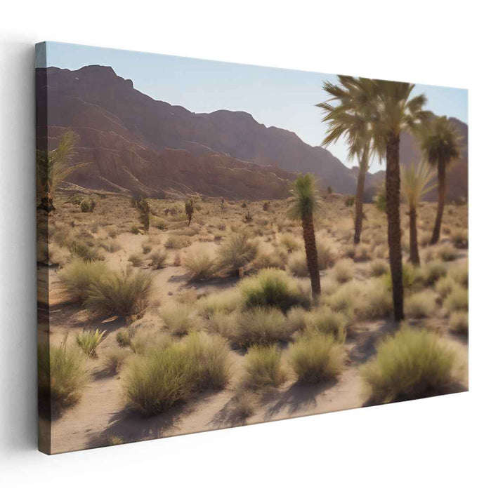 Transform your room into a peaceful retreat with "Ethereal Palm Haven Mirage: Serene Palm Trees in Sunlit Landscape." This canvas art print brings the beauty of a sunlit desert oasis into your home, infusing your space with a sense of calm and tranquility inspired by nature's serene landscapes.