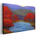 The artist's palette showcases a vibrant red dominating the foliage along the riverbank, creating a fiery contrast against the cool blues and greens of the flowing river and surrounding flora. The soft purples and blues of the distant mountains add a touch of calmness and depth to the composition, enhancing the overall harmony of the piece.