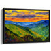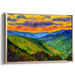 The sky is a masterpiece of gradient blending, transitioning from fiery oranges and yellows near the horizon to cool blues and purples in the distance. The foreground is alive with lush, green hills that gradually give way to deeper blues and purples, creating a harmonious flow throughout the painting. Bold primary colors juxtapose against softer secondary shades of green, blue, and purple, adding depth and complexity to the landscape.