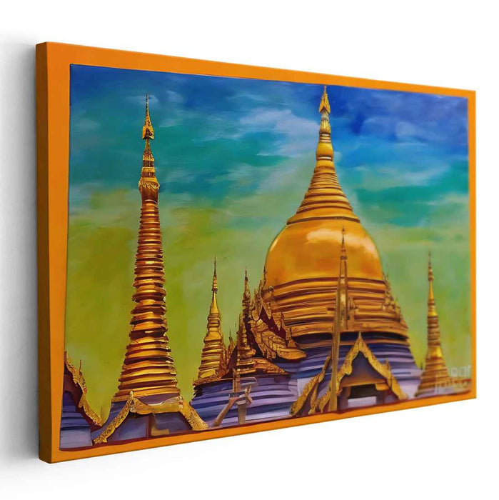 Immerse yourself in the spiritual serenity and architectural beauty of 'Ethereal Shrine Amidst Tranquil Air: Majestic Temple Under Serene Skies,' a captivating canvas art print that brings the essence of Southeast Asian spirituality and design into your home. This artwork features a stunning depiction of a golden temple, possibly inspired by the famous Shwedagon Pagoda in Myanmar. The temple's main stupa, a golden dome that glistens under a tranquil sky, is the central focus. Surrounding it are several smaller stupas and intricate architectural details, all bathed in a golden hue that radiates warmth and enlightenment. The sky behind the temple transitions from a soft yellow near the horizon to a deep teal at the top, creating a serene backdrop that enhances the sanctity of the temple. The use of gold not only emphasizes the sacredness but also adds a luxurious depth to the artwork. This piece perfectly captures the harmony and balance typical of sacred architectural art, making it a profound addition to any collection.