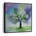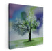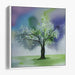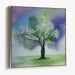 The painting showcases a delicate balance of vibrant green tones of the tree's leaves and trunk set against a softly blurred background painted in a symphony of blues, purples, and hints of pink. The artist's masterful watercolor technique creates a translucent effect, lending the piece an otherworldly lightness and ethereal quality.