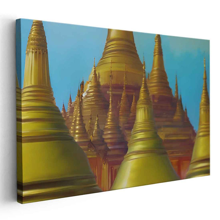 The primary color dominating the artwork is gold, while secondary colors like shades of blue, red, and brown add depth and warmth to the composition. This vivid color contrast amplifies the grandeur of the pagodas, creating a visually striking scene that evokes a serene and contemplative mood.