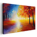 Introducing the enchanting "Ethereal Whispering Woods," a vibrant forest landscape canvas art print that beckons viewers into a mesmerizing autumnal scene, alive with dynamic contrasts and a kaleidoscope of hues. This captivating artwork portrays a tranquil pathway winding through a forest ablaze with the fiery colors of fall, creating a visual symphony of nature's seasonal beauty.