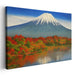 Introducing 'Falling Leaves Embrace Fuji: Autumn at Mount Fuji,' a mesmerizing canvas art print that encapsulates the serene grandeur of Japan's iconic peak, Mount Fuji, set against a picturesque autumnal backdrop. This captivating artwork portrays the snow-capped summit of the mountain, gleaming in pristine white, harmonizing with the vibrant autumn foliage below, creating a visual symphony of colors and contrasts.