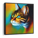 The cat's gaze is the focal point of this artwork, drawing viewers into a world where reality meets fantasy. Set against a backdrop of swirling blues, oranges, and greens, the contrast between the vivid background and the cat's fur creates a striking visual impact that is both energetic and serene.