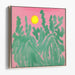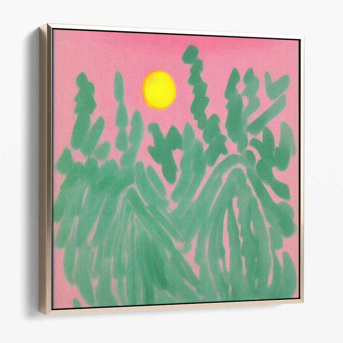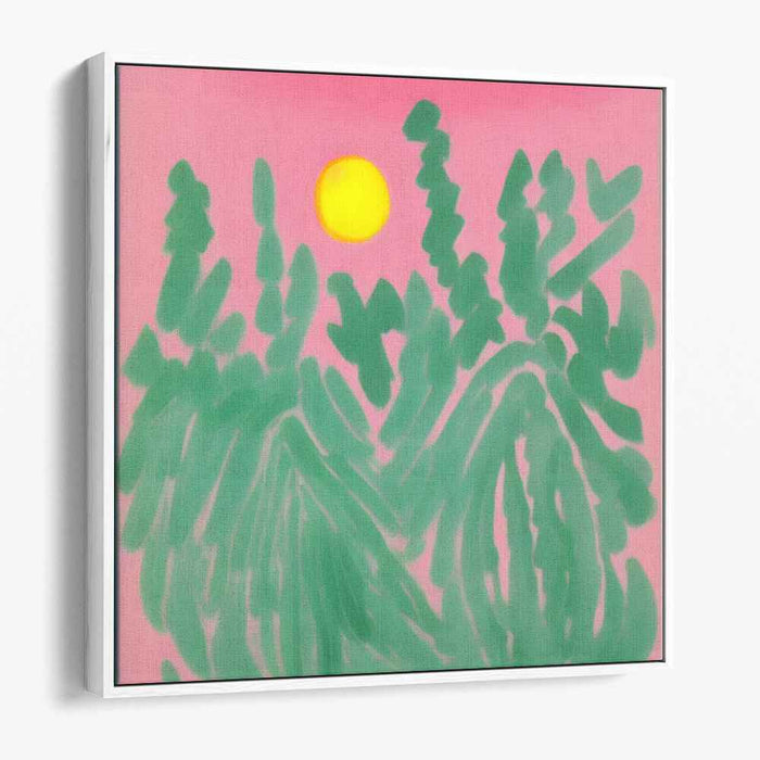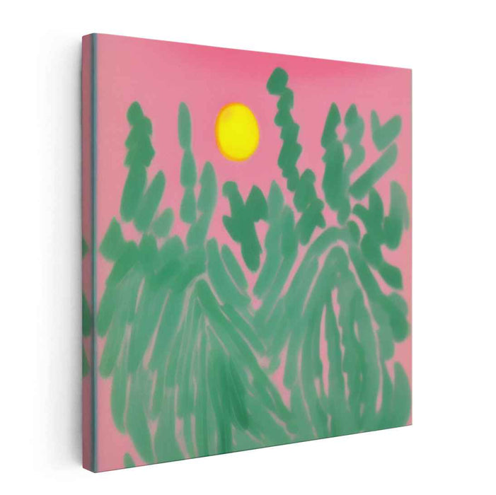 Introducing "Ferns in Blush: Abstract Green Foliage on Pink," a mesmerizing canvas art print that transports you to a serene and whimsical landscape bathed in the soft hues of a pink sky, dominated by a radiant yellow sun. This captivating artwork captures the essence of tranquility and vitality in a modern and minimalist style, perfect for contemporary spaces.