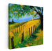 The canvas bursts with a vibrant color palette where the warm yellows and greens of the field and tree harmonize with the brilliant blue sky, creating a captivating contrast. The artist's bold and expressive brushstrokes breathe life into the scene, evoking a profound sense of warmth and tranquility reminiscent of the Impressionist movement's fleeting play of light and color.