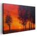Introducing "Fiery Sunset Serenity," a mesmerizing canvas art print that transports viewers into a realm of tranquil awe, capturing the breathtaking beauty of a sunset landscape in vivid, fiery hues. This artwork is a symphony of warm tones dominated by a rich gradient of reds and oranges, painting a mesmerizing backdrop for a row of majestic trees standing tall against the vibrant canvas.