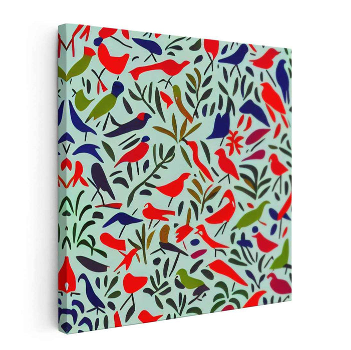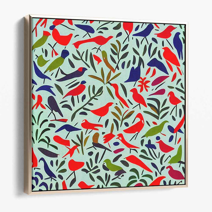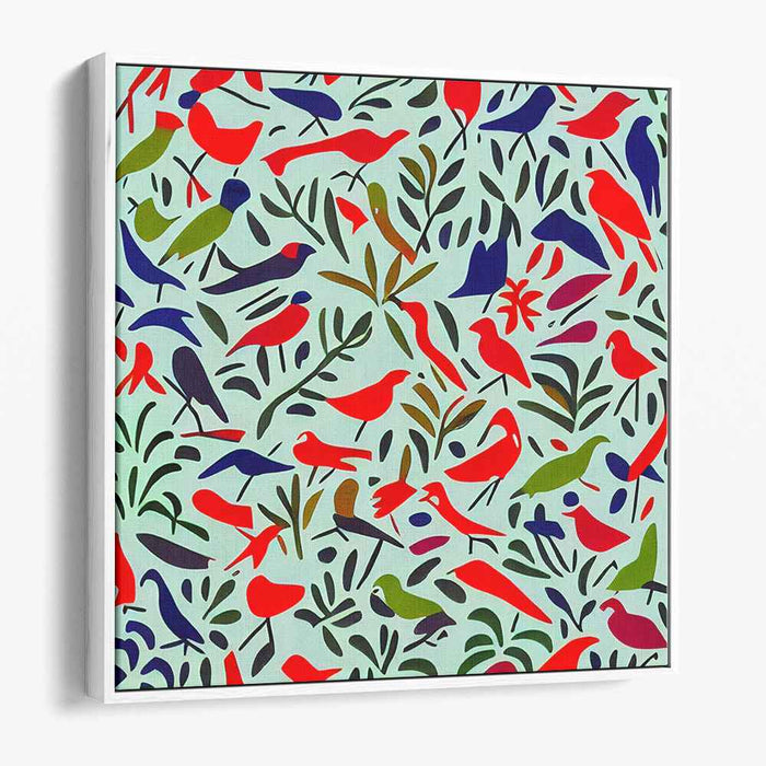 The artwork unfolds against a serene teal backdrop, where red, blue, and green birds take center stage in a charming and simplistic style. Each bird boasts a unique shape, standing out against the backdrop of dense, leafy greens that weave a tapestry of vibrant hues. The foliage, depicted in shades of green with subtle hints of navy, adds depth and texture, evoking a sense of a wild yet meticulously arranged garden.