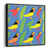 Introducing 'Flighty Feathers Frenzy: Playful Pop Art Birds,' a captivating canvas art that brings a burst of color and energy into any space, evoking feelings of joy and whimsy with its delightful representation of stylized birds against a serene blue backdrop. Each bird is depicted in bold, geometric shapes, adorned in a vibrant palette of red, yellow, orange, and black, standing out vividly against the calming blue canvas.