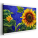Introducing "Floral Echoes on Cascading Canvas," a captivating canvas art print that celebrates the vibrant beauty of sunflowers against a dramatic blue backdrop. This stunning artwork showcases a large, intricately detailed sunflower in full bloom, its golden-yellow petals elegantly contrasting with the deep brown center, creating a visually striking focal point. Surrounding this majestic bloom are subtle hints of additional sunflowers and lush green leaves, adding depth and intricacy to the composition.
