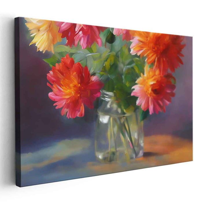 Introducing 'Floral Euphoria,' a captivating canvas art print that encapsulates the vibrant essence of a blooming floral bouquet elegantly arranged in a clear glass jar. This exquisite artwork immediately captivates with its explosion of colors and meticulous attention to detail, showcasing each petal and leaf with unparalleled precision.