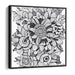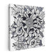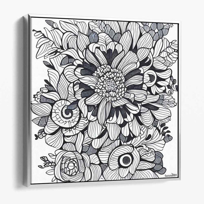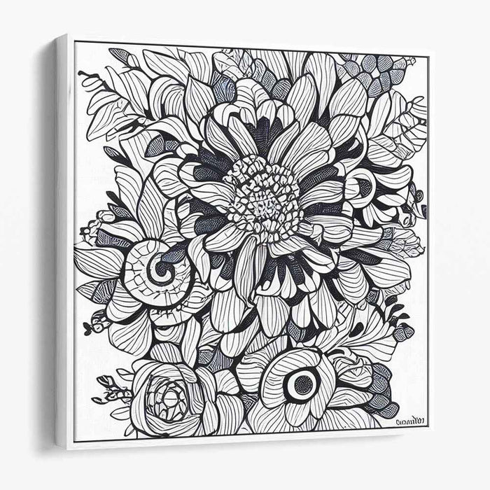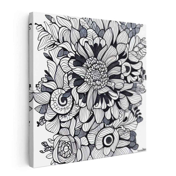 Introducing 'Floral Intricacy: Black and White Botanical Illustration,' a mesmerizing canvas art that showcases a symphony of meticulously designed floral elements, intricately arranged to form a captivating and almost hypnotic pattern. At its core lies a meticulously detailed flower, surrounded by a plethora of botanical shapes, from delicate spirals to lush, petal-filled blooms.