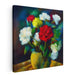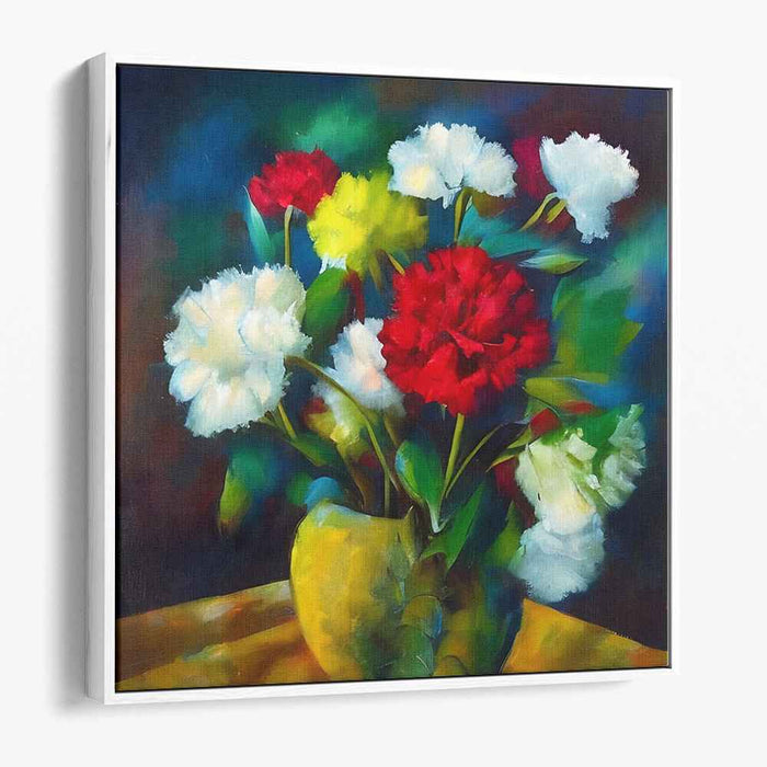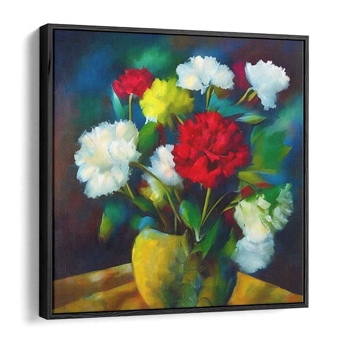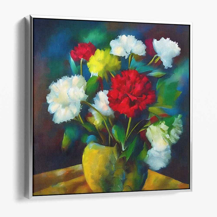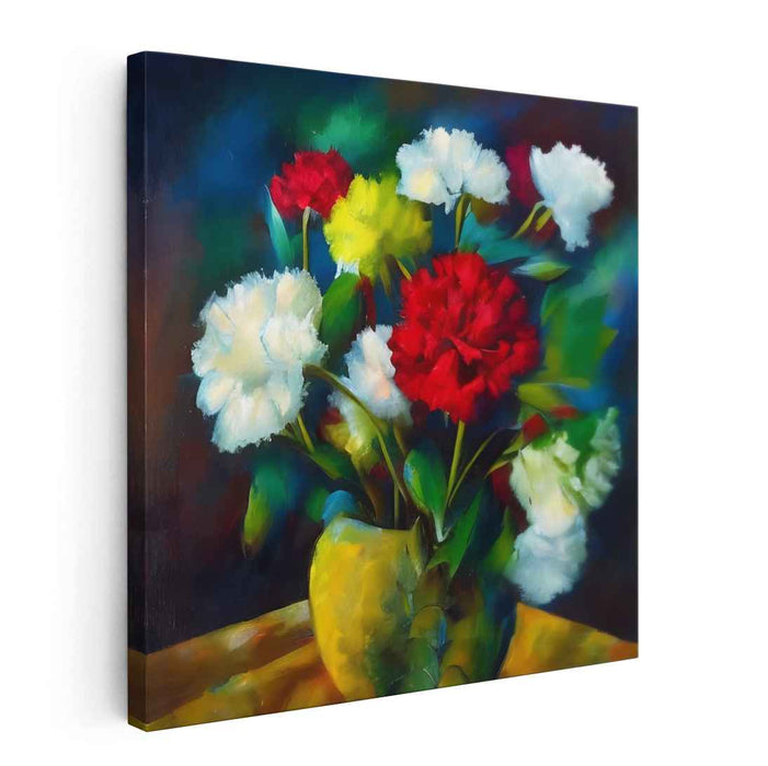 Introducing 'Floral Tapestry Blooms: Lush Textured Floral Canvas Art,' a captivating masterpiece that pays homage to the splendor of nature through a vibrant floral arrangement. This artwork showcases a lively bouquet of flowers, predominantly featuring rich red and white carnations accented with touches of yellow blooms, elegantly presented in a classic yellow vase. The blossoms bloom against a deep, dark backdrop, intensifying the brilliance of their petals and leaves.