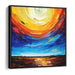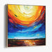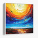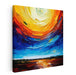 Step into the mesmerizing world of 'Fluid Currents: A Dynamic Abstract Seascape,' a vibrant canvas art piece that mesmerizes with its abstract interpretation of a seascape meeting the sky in a riot of colors. This artwork features a striking blend of deep blues and aquamarine at the bottom, symbolizing the sea, transitioning to fiery oranges, radiant yellows, and passionate reds above, representing the sky.