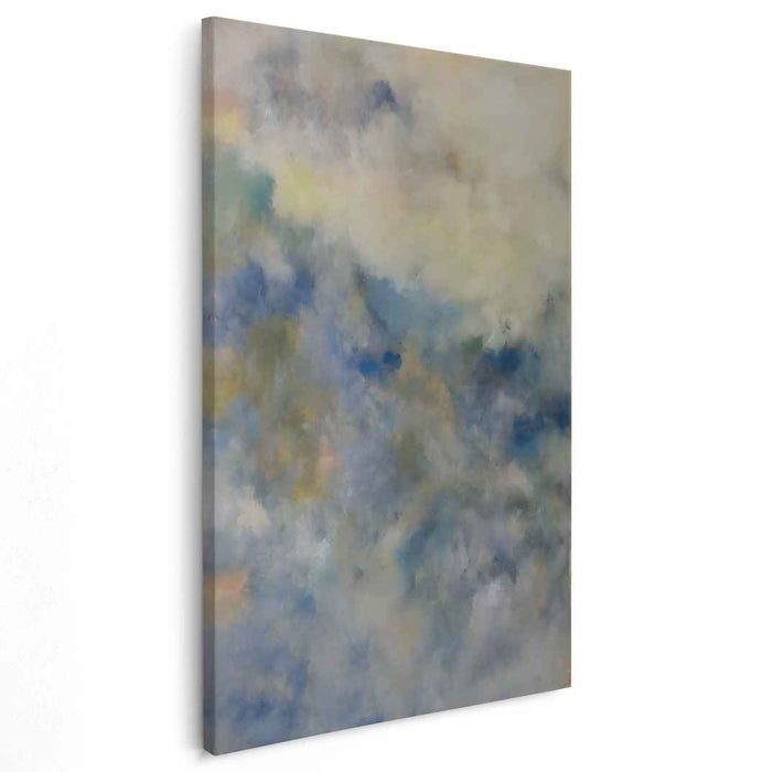 The painting is a harmonious blend of blues, whites, and delicate hints of yellow and green, creating a serene and peaceful ambiance. The soft, cloud-like formations delicately float across the canvas, reminiscent of a boundless sky or a gentle mist over an ocean, adding a touch of mystery and serenity to the composition. The play of light and shadow enhances the depth of the artwork, pulling you into a contemplative state of peaceful reverie.