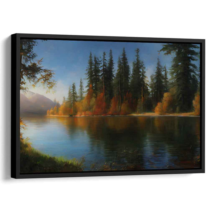 The artwork is a visual symphony of colors, with towering pine trees dominating the backdrop, their deep green needles contrasting harmoniously with the warm tones of autumn leaves. The artist's masterful use of shades like orange, red, and yellow captures the essence of changing seasons, infusing the scene with depth and vibrancy. The soft, golden light of dawn or dusk bathes the landscape, casting a serene and reflective aura over the entire composition.