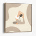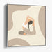The composition showcases the woman in a white sports top and grey leggings, her hair braided and cascading down her back, adding a touch of sophistication to the serene scene. The backdrop, enveloped in soft, neutral tones of beige and light brown, features organic shapes and delicate line work, enhancing the overall sense of calm and fluidity. The minimalist style, characterized by clean lines and a gentle color palette, evokes a profound feeling of serenity and mindfulness, making it an ideal choice for cultivating a peaceful ambiance.