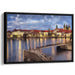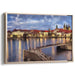 Introducing the captivating canvas art print, 'Gothic Frames of Love,' a mesmerizing depiction of a historical cityscape at dusk that transports viewers to a moment of tranquil beauty and architectural grandeur. This artwork presents a panoramic vista of a majestic river teeming with life, adorned by an iconic bridge and exquisite gothic structures that adorn the backdrop.