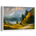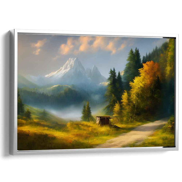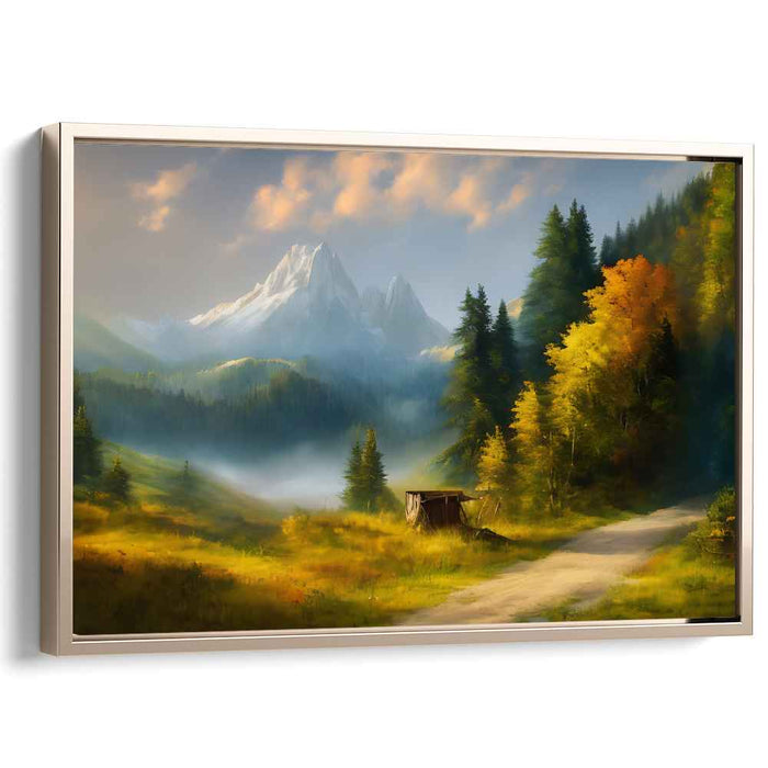The foreground of this masterpiece is a harmonious blend of autumnal hues, with trees painted in luscious tones of gold, orange, and green, reminiscent of the richness of the fall season. A soft mist delicately blankets the meadow, infusing the scene with a surreal and ethereal ambiance. Nestled within this idyllic setting is a charming wooden cabin and a meandering dirt path, beckoning the observer to embark on a visual journey through this tranquil paradise.