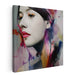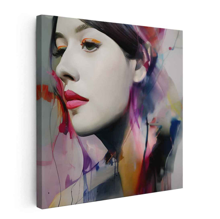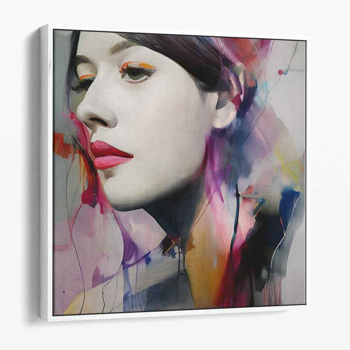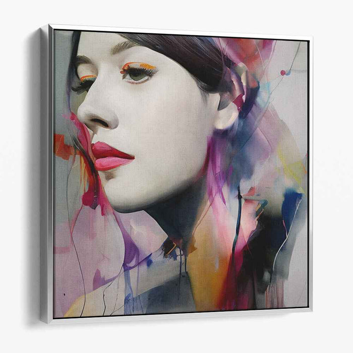 Introducing 'Identity Layers Revealed,' a captivating canvas art that showcases a contemporary abstract portrait of a woman, blending realistic portraiture with abstract elements to create a modern yet timeless piece. The artwork presents a striking portrayal of a young woman with exquisite detail in her face, featuring smooth, lifelike skin tones juxtaposed against vibrant, flowing colors that envelop her.