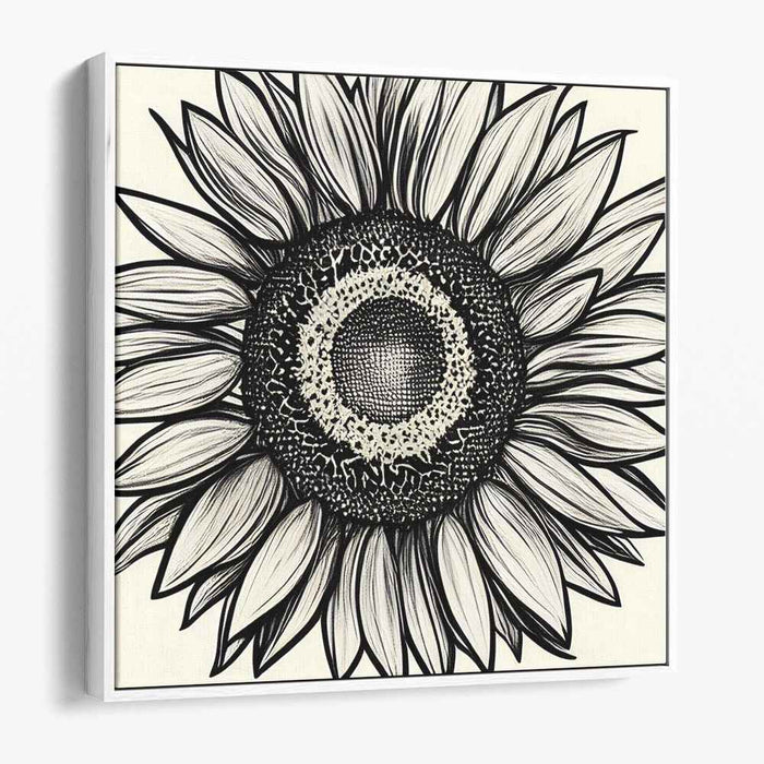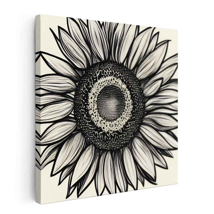 Introducing 'Ink Melody,' a mesmerizing black and white floral canvas art print that celebrates the intricate beauty of a sunflower in full bloom. This captivating artwork meticulously captures the delicate details of each petal, skillfully contrasting dark, bold outlines with light, textured shading.