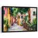 Step into the tranquil allure of 'Ink Trails and Azure Waters: A Watercolor Journey,' a mesmerizing canvas art print that whisks you away to a sun-kissed alley in a charming Mediterranean village. The artwork beautifully encapsulates a serene street adorned with vivid, pastel-hued buildings in tones of orange, pink, and yellow, harmoniously set against the verdant foliage and the refreshing, shady path.