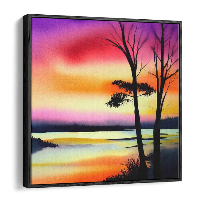 Introducing the enchanting "Inkblot Horizon: Watercolor Silhouette Landscape Canvas Art Print," a captivating piece that transports viewers into a serene sunset landscape, alive with a mesmerizing play of colors and a profound sense of tranquility. This artwork beautifully captures a horizon ablaze with vibrant fiery oranges and deep magentas, gracefully transitioning into soothing purples and blues as the sky ascends, painting a picture of serene beauty.