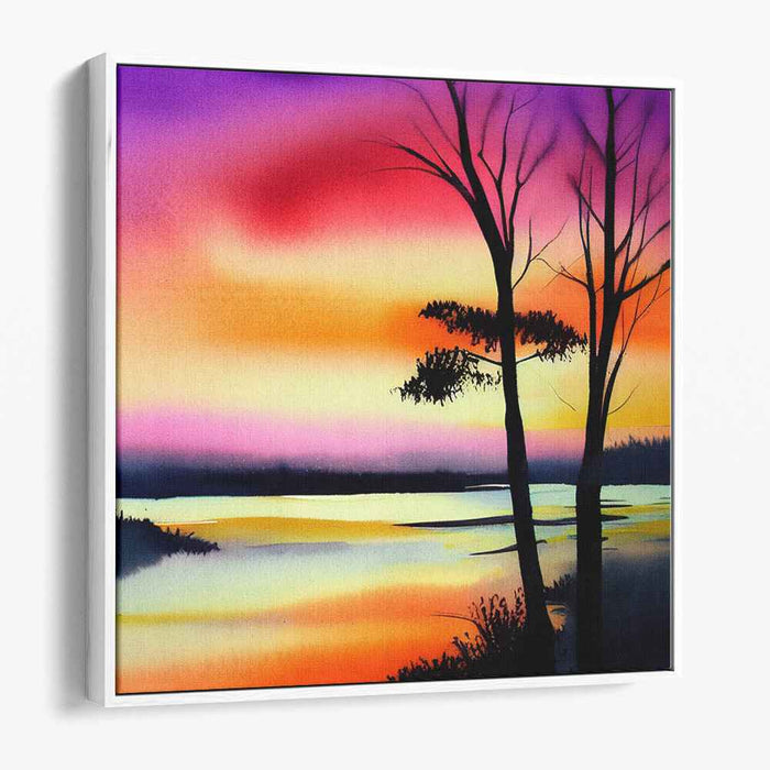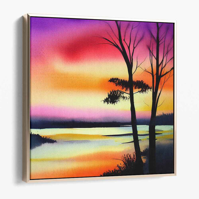 The masterpiece features a setting sun casting a golden reflection on the tranquil waters below, creating a mirror-like serenity that enhances the overall peaceful ambiance. Two bare trees stand elegantly as silhouettes against this breathtaking backdrop, their branches reaching skyward, adding a natural touch of grace to the composition. The artist skillfully employs a watercolor technique, allowing colors to blend seamlessly, crafting a soft, ethereal atmosphere that invites contemplation and introspection.