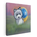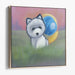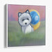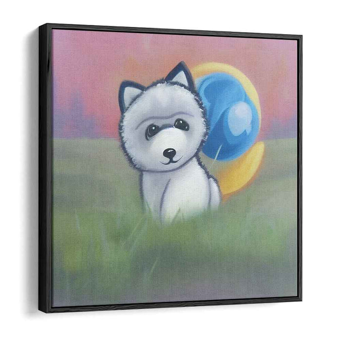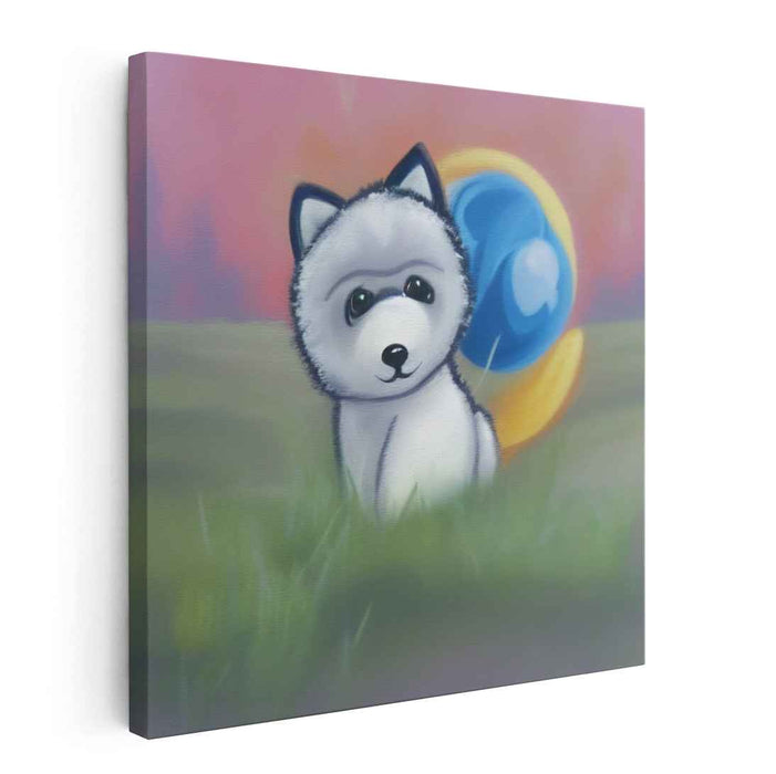 Introducing 'Innocent Play,' a heartwarming canvas art print that captures the essence of joy and innocence through an adorable depiction of a fluffy white puppy in a lush green meadow. This enchanting artwork transports viewers to a serene and dreamy setting, where a playful puppy with expressive eyes exudes curiosity and innocence.