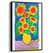 Introducing 'Joyful Sunflowers,' a modern Fauvist floral canvas art print that radiates with vibrant energy and playful charm, reminiscent of the iconic works of Vincent van Gogh but with a contemporary twist. This delightful artwork captures the essence of joy and liveliness through a cheerful portrayal of sunflowers in a vase.