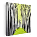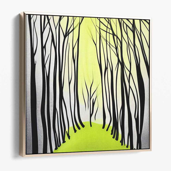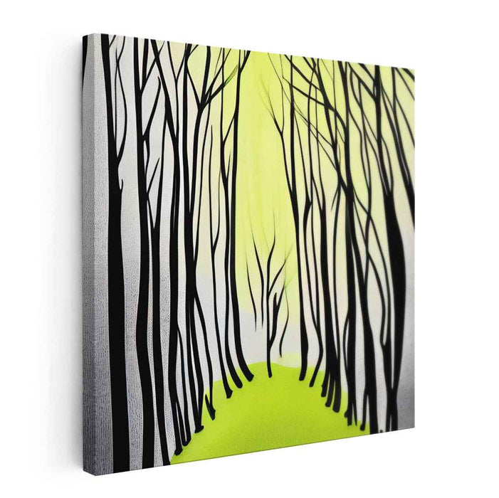Introducing 'Lime Strokes on Black,' a mesmerizing canvas art print that transports viewers into an ethereal forest landscape, where light and shadow dance in harmony, creating a captivating visual journey. The artwork centers around tall, slender trees, their black silhouettes sharply contrasting against a luminous backdrop, drawing the eye into a world of mystery and intrigue.