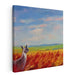 Introducing 'Llama's Tranquil Gaze,' an expressionist landscape canvas art print that captures a serene and vivid scene where a llama gazes thoughtfully into the distance, surrounded by a vibrant and wild grassy field painted in fiery hues of red, orange, and yellow. The backdrop reveals a harmonious blend of green fields and blue mountains, creating a captivating contrast.