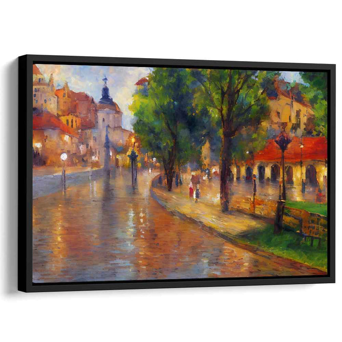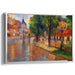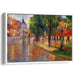 Introducing 'Love's Brushstrokes Cityscape: Romantic Impressionist Cityscape,' a mesmerizing canvas art print that transports viewers to a tranquil urban setting drenched in the enchanting glow of early morning or late afternoon light. This captivating artwork depicts a charming street scene, possibly set in a historic European city, where the glistening cobblestone streets reflect the warm, golden hues, infusing the scene with a dreamlike ambiance.