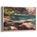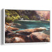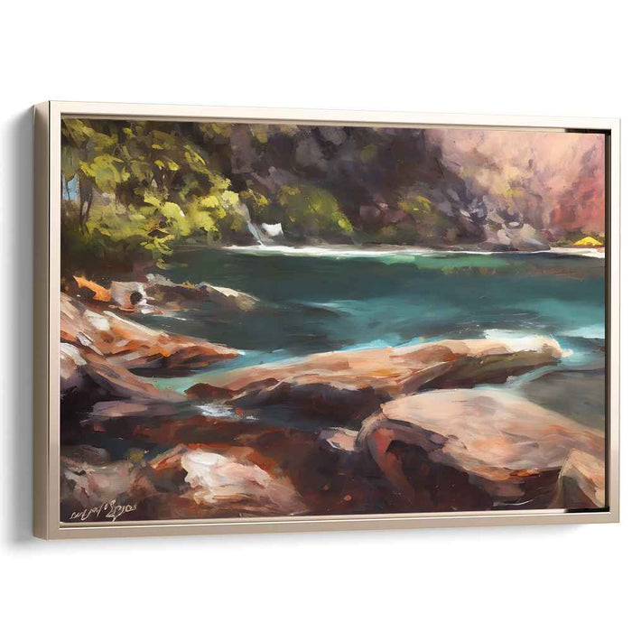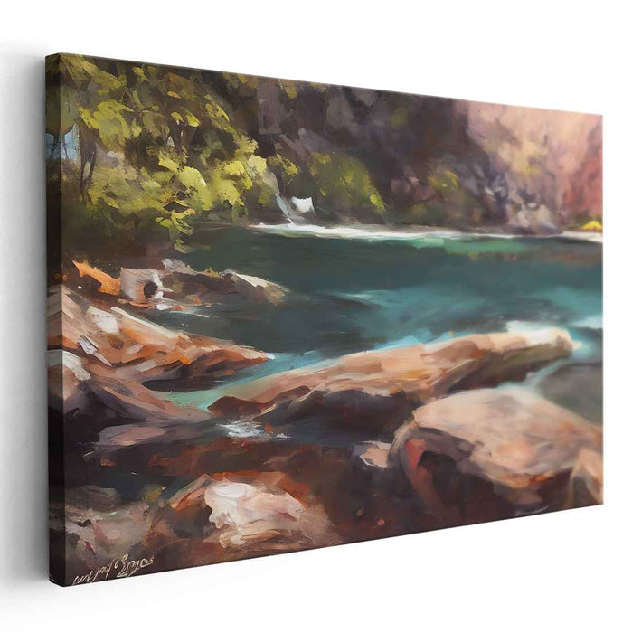 The foreground of the painting is adorned with rugged, sunlit rocks that gracefully lead the viewer's gaze towards the tranquil river. The river itself is depicted in vivid shades of turquoise and emerald, creating a striking contrast against the warm tones of the rocks and the lush greenery along the riverbanks. In the background, subtle hints of trees and a rocky cliff bathed in sunlight add depth and mystery to the scene. Noteworthy is the masterful play of light and shadow, enhancing the texture of the rocks and the fluidity of the water, bringing the entire composition to life.