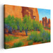 Immerse yourself in the breathtaking beauty of "Luminous Mirage Haven: Sunlit Rock Formations and Verdant Oasis," a mesmerizing landscape canvas art that transports you deep into a sun-kissed desert realm, where nature's vibrant palette dances across the canvas. This captivating artwork showcases towering, rust-colored rock formations that stand proudly against a clear, azure sky, capturing the rugged texture and grandeur of these natural wonders with awe-inspiring detail.