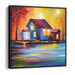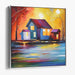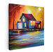 Step into the enchanting world of 'Luminous Retreat: Colorful Expressionist Lakeside Home Canvas Art,' a mesmerizing portrayal of a tranquil lakeside home basking in the ethereal glow of a sunset. The artwork unfolds against a backdrop ablaze with fiery oranges, deep blues, and vivid yellows, evoking a sense of warmth and emotional depth.