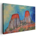Introducing 'Majestic Buttes at Sunset,' a captivating canvas art print that transports viewers to a breathtaking landscape of towering rock formations basking in the glow of a vivid sky. This mesmerizing artwork features two prominent buttes, rising majestically above a rugged terrain, their fiery red surfaces illuminated as if kissed by the setting sun.