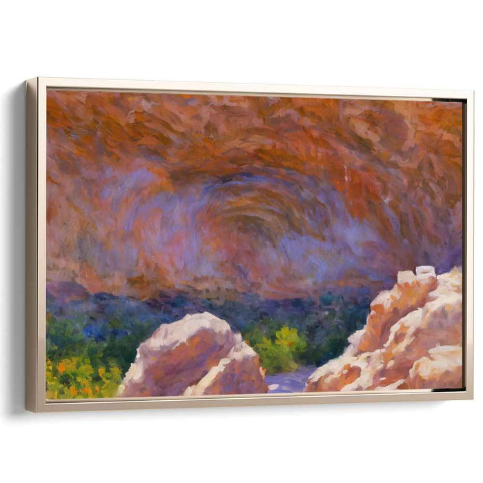 Introducing 'Majestic Cavern,' an awe-inspiring impressionist landscape canvas art print that transports viewers into the breathtaking beauty of a natural rock formation, possibly a cave or an arch, depicted in vivid and dynamic colors. The artwork captivates with a swirling pattern of warm earthy tones—rich reds, fiery oranges, and deep browns—that imbue the rock surfaces with depth and texture.