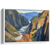 The canvas comes alive with earthy hues of ochre, sienna, and burnt umber dominating the majestic cliffs and rocks, while the river sparkles in tones of white and blue, mirroring the vast sky above. In the background, distant mountains painted in cool blues and purples add depth and expansiveness to the scene, enhancing its visual richness.