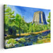 Introducing "Majestic Monolith Mirage," a mesmerizing watercolor landscape canvas art that transports viewers into the heart of nature's tranquility, showcasing the majestic Devil's Tower standing tall amidst a lush, verdant environment. This captivating artwork skillfully captures the imposing presence of the tower against a vibrant blue sky, creating a scene of grandeur and serenity.