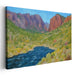 Introducing 'Majestic River Valley: Tranquil Landscape Canvas Art Print,' a captivating piece that transports viewers to a serene river valley nestled amidst vibrant, towering cliffs. This mesmerizing artwork depicts a river meandering through a lush, verdant landscape, embraced by majestic rust-colored cliffs that soar against a clear blue sky.