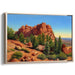 The artist's meticulous attention to detail brings the texture of the rocks to life, showcasing their jagged edges and crevices with remarkable realism. The color palette is rich and diverse, with earthy reds and browns dominating the rocks, vibrant greens of the trees, and a brilliant blue sky transitioning to a warm, golden hue near the horizon, hinting at the magic of either sunrise or sunset.