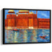 Introducing 'Maritime Memory Lane: Historical Waterfront Scene,' a captivating canvas art print that transports viewers to a majestic waterfront setting filled with historical grandeur and tranquil reflections. This artwork showcases an impressive structure reminiscent of Mughal architecture, characterized by robust red-orange walls and intricate golden domes that stand out against the serene blue sky.