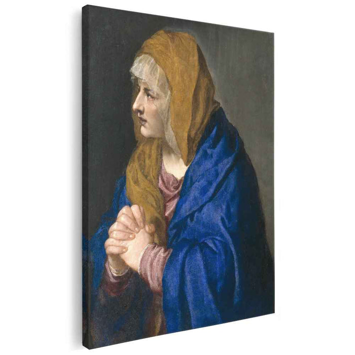 Immerse yourself in the poignant beauty of Titian's "Mater Dolorosa" (c. 1550), now available as a stunning canvas print. This masterpiece, created during the artist's late period, captures the profound sorrow of the Virgin Mary as she mourns the loss of her son, Jesus Christ.