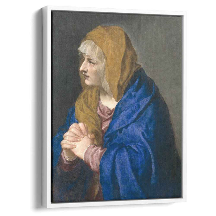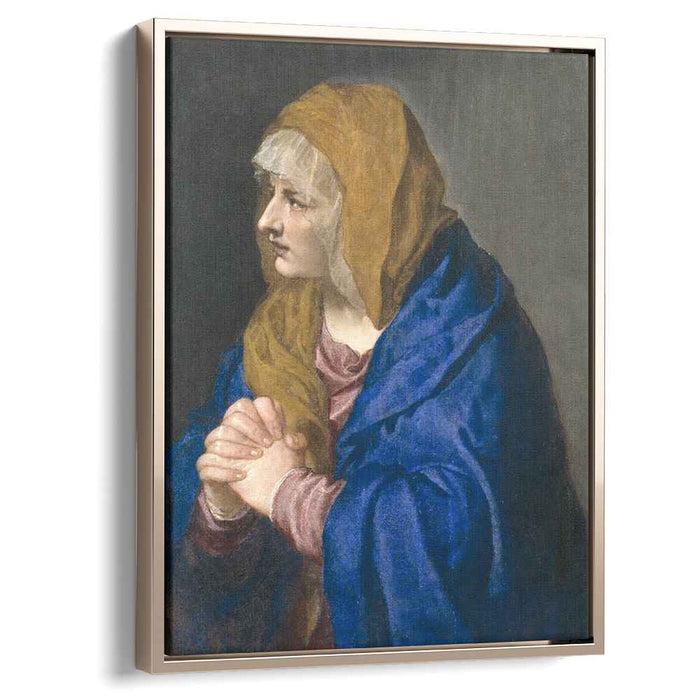 The Virgin Mary is depicted in a traditional pose, her hands clasped in prayer and her head bowed in sorrow. Her red robe symbolizes her suffering, while the blue cloak represents her steadfast faith. The painting's composition draws the viewer's attention to her face, where the depth of her pain is etched into every line.